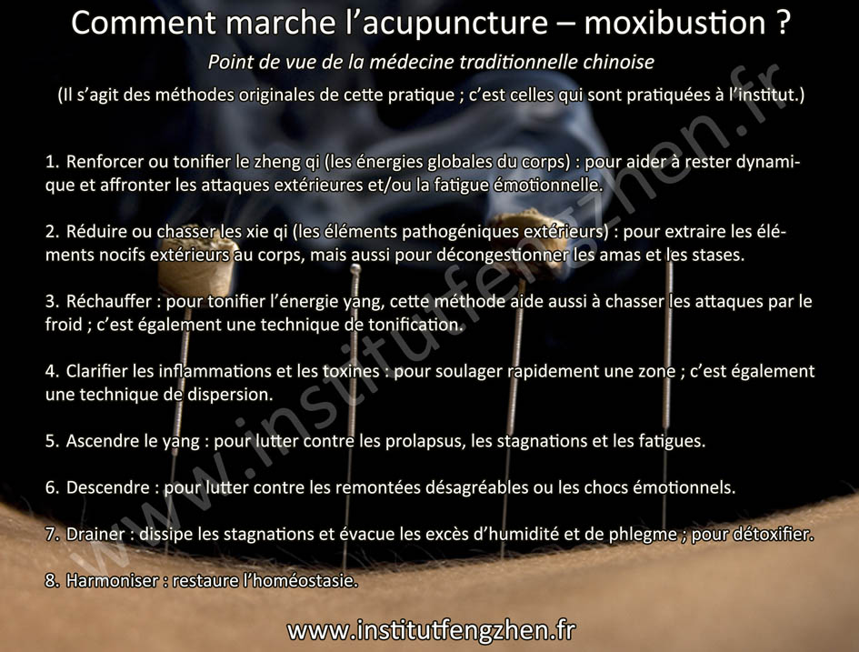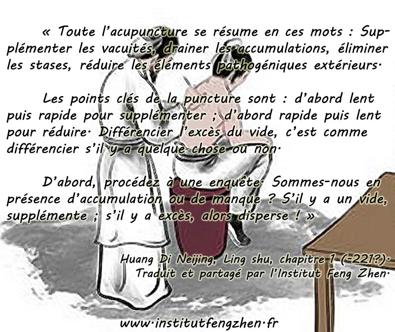 Pratique singulière qui nous vient de la Chine ancienne, l'acupuncture consiste à rétablir l’équilibre énergétique en débarrassant l'individu de ses blocages. À l'aide des quatre méthodes, 望 wàng - observer, 闻 wén - ausculter, 问 wèn - interroger, 切 qiè - palper, le praticien obtient un bilan énergétique qui lui permet de choisir les points d'acupuncture les plus pertinents. Cette sélection n'est en rien hasardeuse. Elle fait appelle à une solide expérience et une étude approfondie des méridiens ainsi que des points qui les forment. La pose d'aiguilles très fines, judicieusement placées, permet de se débarrasser des tensions accumulées tout en rétablissant la bonne circulation dans les tissus, ce qui favorise leur régénérescence. Suivant la méthode, déterminée selon les principes traditionnels, ce sont soit les éléments perturbateurs (邪气 xié qì) qui sont chassés, soit les défenses (正气 zhèng qì) qui sont stimulées et renforcées. Les deux méthodes peuvent aussi être associées.