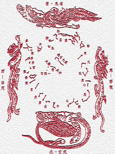 Dans la mythologie populaire, l’oiseau vermillon incarne l’esprit du sud. Dans le taoïsme, il est l’une des quatre déités qui départagent le ciel. Parmi les 28 loges lunaires, il se manifeste dans les 7 du sud : Jing, Gui, Liu, Xing, Zhang, Yi, Zhen. Son apparence est celle d’un oiseau, son point cardinal est le sud, son élément est le feu, sa couleur est le rouge vermillon, c’est pourquoi on l’appelle « Zhu Que » ou « l’oiseau vermillon ».