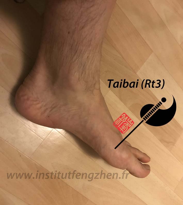 Références classiques : « Jiayi jing » : Taibai (Rt3) traite : les maladies fébriles, les suffocation avec impossibilité de s’allonger, les distensions et les gargouillements douloureux,le corps lourd avec les articulations raides.