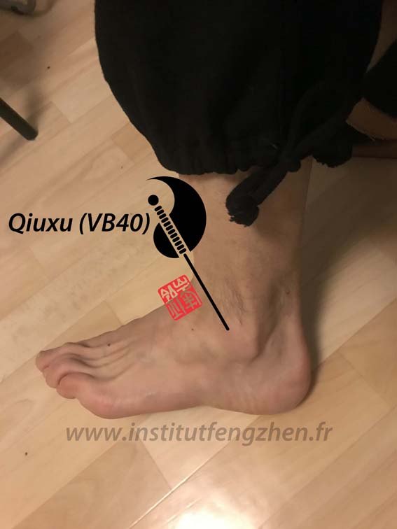 Références classiques : « Jiayi jing » : Qiuxu (VB40) traite la vision trouble, les grelottements dus au froid, la cataracte, l’aveuglement, la taille et les hypocondres douloureux, les crampes aux jambes.