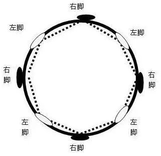 2/ Lors de la marche en cercle, normalement on fait 8 pas. Mais en réalité c’est très variable, de 10 pas pour un plus grand cercle, ou encore 3, ou 6 pour un petit cercle. Les débutant doivent commencer par un cercle plus grand. On peut marcher sur un cercle tracé d’avance ou non ; ou encore, autour d’un arbre. Quand on marche en cercle, il faut surtout ne pas le faire dans un seul sens ! Il est nécessaire de répartir la marche entre la gauche et la droite, etc. Le nombre de changement est laissé au regard du pratiquant. La méthode pour changer de direction est : Le pied droit ferme perpendiculairement – koubu- devant le pied gauche. La pointe du pied droit est donc en direction du centre. Ensuite la taille – yao – vrille dans l’autre sens. Le pied gauche la suit naturellement pour former le pas ouvert – baibu- puis le corps se tourne vers le centre du cercle et reprend la marche. Inverser les pas pour tourner dans l’autre sens.